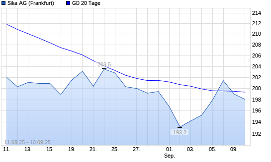 Mit dem Rücksetzer auf 199,00 EUR hat die Sika-Aktie am 09.09.2025 die 20-Tage-Linie nach unten gekreuzt.