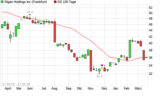 Mit dem Anstieg auf 36,00 EUR hat die Silgan Holdings-Aktie am 16.03.2026 die 100-Tage-Linie nach oben gekreuzt.