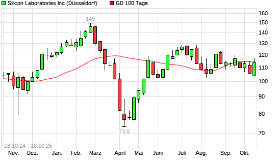 Mit dem Rücksetzer auf 116,00 EUR hat die Silicon Labs-Aktie am 17.10.2025 die 100-Tage-Linie nach unten gekreuzt.
