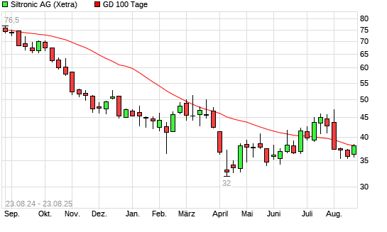 Mit dem Anstieg auf 38,28 EUR hat die Siltronic-Aktie am 22.08.2025 die 100-Tage-Linie nach oben gekreuzt.Die Siltronic-Aktie befindet sich seit dem 29.07.2025 im langfristigen Abwärtstrend ...weiterlesen