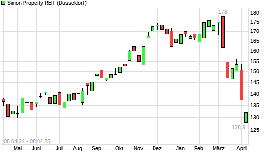 Mit dem Rücksetzer auf 125,40 EUR hat die Simon Property-Aktie (ISIN US8288061091) am 07.04.2025 ein neues 12-Monats-Tief erreicht und damit den Kurs vom 17.04.2024 eingestellt.