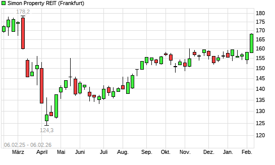 Mit dem Anstieg auf 164,40 EUR hat die Simon Property-Aktie (ISIN US8288061091) am 05.02.2026 ein neues 6-Monats-Hoch erreicht und damit den Kurs vom 02.02.2026 eingestellt.