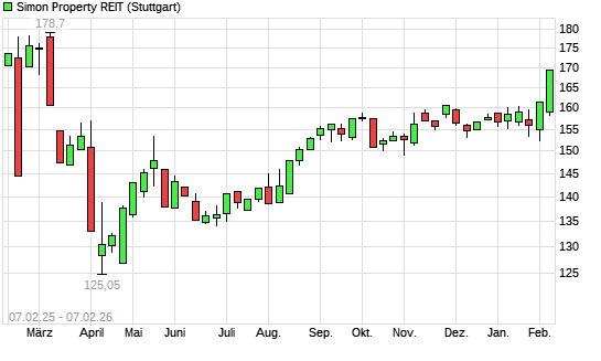 Mit dem Anstieg auf 168,00 EUR hat die Simon Property-Aktie (ISIN US8288061091) am 06.02.2026 ein neues 6-Monats-Hoch erreicht und damit den Kurs vom 05.02.2026 eingestellt.