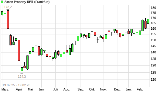 Mit dem Anstieg auf 170,25 EUR hat die Simon Property-Aktie (ISIN US8288061091) am 18.02.2026 ein neues 6-Monats-Hoch erreicht und damit den Kurs vom 17.02.2026 eingestellt.