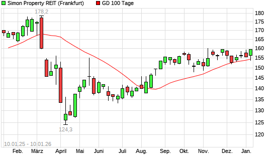 Mit dem Anstieg auf 159,40 EUR hat die Simon Property-Aktie am 09.01.2026 die 100-Tage-Linie nach oben gekreuzt.