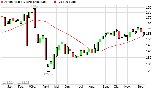 Mit dem Rücksetzer auf 152,15 EUR hat die Simon Property-Aktie am 10.12.2025 die 100-Tage-Linie nach unten gekreuzt.