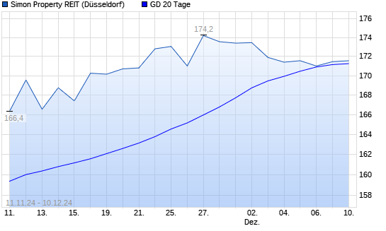 Mit dem Rücksetzer auf 170,90 EUR hat die Simon Property-Aktie am 09.12.2024 die 20-Tage-Linie nach unten gekreuzt.