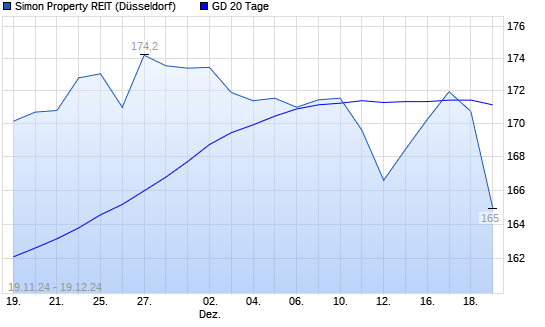 Mit dem Rücksetzer auf 170,55 EUR hat die Simon Property-Aktie am 18.12.2024 die 20-Tage-Linie nach unten gekreuzt.