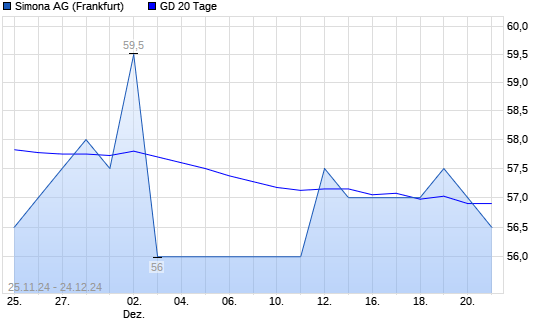 Mit dem Rücksetzer auf 56,50 EUR hat die Simona-Aktie am 23.12.2024 die 20-Tage-Linie nach unten gekreuzt.