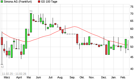 Mit dem Rücksetzer auf 48,60 EUR hat die Simona-Aktie am 10.02.2026 die 100-Tage-Linie nach unten gekreuzt.Die Simona-Aktie befindet sich seit dem 15.09.2025 im langfristigen Abwärtstrend ...weiterlesen