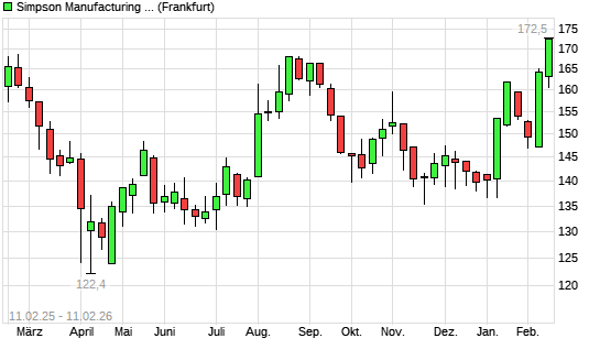 Mit dem Anstieg auf 172,40 EUR hat die Simpson Manufacturing Company-Aktie (ISIN US8290731053) am 10.02.2026 ein neues 12-Monats-Hoch erreicht und damit den Kurs vom 18.02.2025 eingestellt.