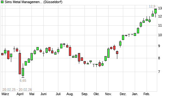 Mit dem Anstieg auf 12,90 EUR hat die Sims Metal Management-Aktie (ISIN AU000000SGM7) am 19.02.2026 ein neues 3-Jahres-Hoch erreicht und damit den Kurs vom 18.02.2026 eingestellt.Die ...weiterlesen