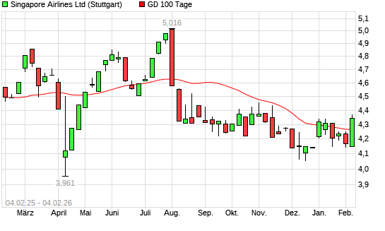 Mit dem Anstieg auf 4,30 EUR hat die Singapore Airlines-Aktie am 03.02.2026 die 100-Tage-Linie nach oben gekreuzt.