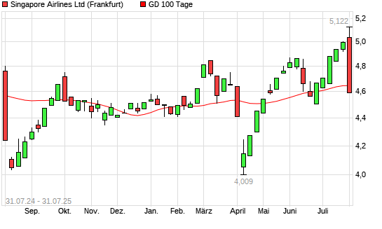 Mit dem Rücksetzer auf 4,60 EUR hat die Singapore Airlines-Aktie am 30.07.2025 die 100-Tage-Linie nach unten gekreuzt.