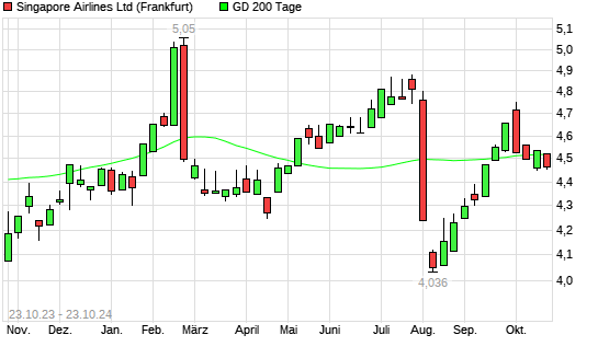 Mit dem Rücksetzer auf 4,45 EUR hat die Singapore Airlines-Aktie am 22.10.2024 die 200-Tage-Linie nach unten gekreuzt.