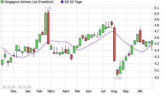 Mit dem Rücksetzer auf 4,40 EUR hat die Singapore Airlines-Aktie am 30.10.2024 die 50-Tage-Linie nach unten gekreuzt.