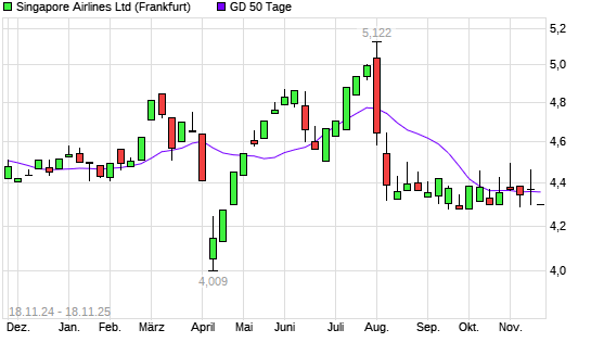 Mit dem Rücksetzer auf 4,30 EUR hat die Singapore Airlines-Aktie am 17.11.2025 die 50-Tage-Linie nach unten gekreuzt.Die Singapore Airlines-Aktie befindet sich seit dem 07.08.2025 im langfristigen ...weiterlesen