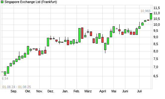 Mit dem Anstieg auf 10,88 EUR hat die Singapore Exchange-Aktie (ISIN SG1J26887955) am 31.07.2025 ein neues All-Time-High erreicht und damit den Kurs vom 28.07.2025 eingestellt.