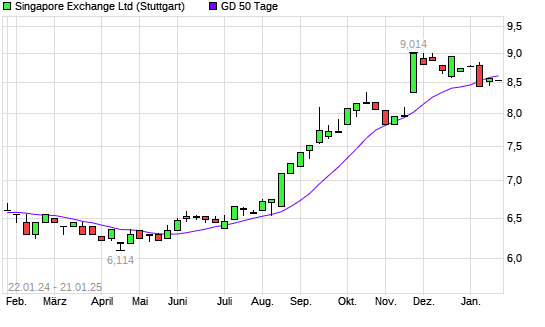 Mit dem Rücksetzer auf 8,54 EUR hat die Singapore Exchange-Aktie am 20.01.2025 die 50-Tage-Linie nach unten gekreuzt.
