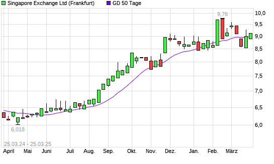 Mit dem Rücksetzer auf 8,90 EUR hat die Singapore Exchange-Aktie am 24.03.2025 die 50-Tage-Linie nach unten gekreuzt.
