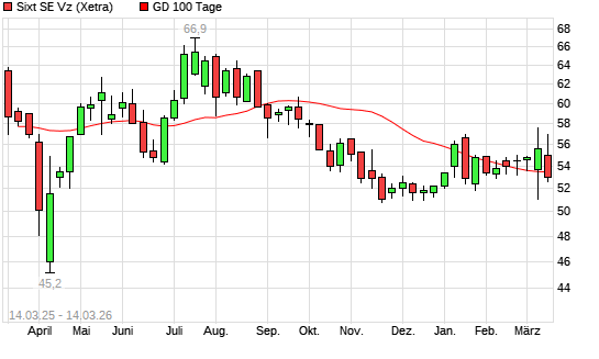 Mit dem Rücksetzer auf 53,10 EUR hat die Sixt Vz-Aktie am 13.03.2026 die 100-Tage-Linie nach unten gekreuzt.