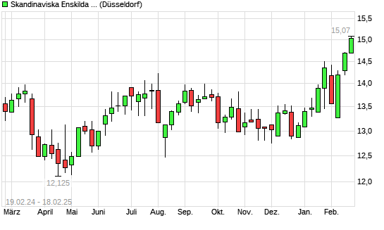 Mit dem Anstieg auf 14,98 EUR hat die Skandinaviska Enskilda Banken-Aktie (ISIN SE0000148884) am 17.02.2025 ein neues All-Time-High erreicht und damit den Kurs vom 23.01.2025 eingestellt.