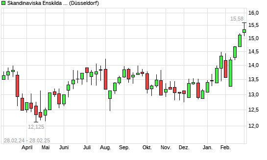 Mit dem Anstieg auf 15,53 EUR hat die Skandinaviska Enskilda Banken-Aktie (ISIN SE0000148884) am 27.02.2025 ein neues All-Time-High erreicht und damit den Kurs vom 25.02.2025 eingestellt.