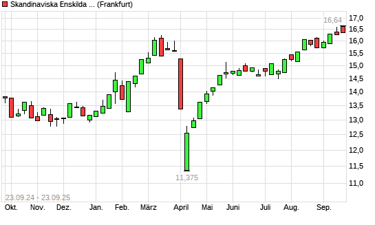 Mit dem Anstieg auf 16,64 EUR hat die Skandinaviska Enskilda Banken-Aktie (ISIN SE0000148884) am 22.09.2025 ein neues All-Time-High erreicht und damit den Kurs vom 16.09.2025 eingestellt.