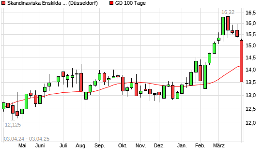 Mit dem Rücksetzer auf 14,09 EUR hat die Skandinaviska Enskilda Banken-Aktie am 02.04.2025 die 100-Tage-Linie nach unten gekreuzt.