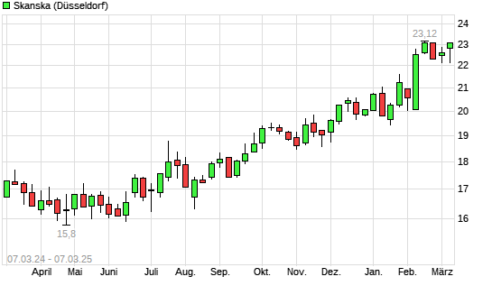 Mit dem Anstieg auf 23,15 EUR hat die Skanska-Aktie (ISIN SE0000113250) am 06.03.2025 ein neues 3-Jahres-Hoch erreicht und damit den Kurs vom 13.02.2025 eingestellt.