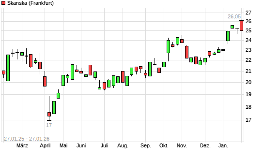 Mit dem Anstieg auf 26,05 EUR hat die Skanska-Aktie (ISIN SE0000113250) am 26.01.2026 ein neues All-Time-High erreicht und damit den Kurs vom 16.01.2026 eingestellt.