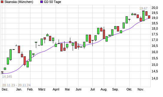 Mit dem Rücksetzer auf 18,89 EUR hat die Skanska-Aktie am 19.11.2024 die 50-Tage-Linie nach unten gekreuzt.