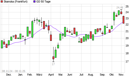 Mit dem Rücksetzer auf 22,20 EUR hat die Skanska-Aktie am 07.11.2025 die 50-Tage-Linie nach unten gekreuzt.Die Skanska-Aktie befindet sich seit dem 09.09.2025 im langfristigen Aufwärtstrend ...weiterlesen