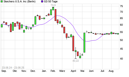 Mit dem Anstieg auf 54,24 EUR hat die Skechers-Aktie am 22.08.2025 die 50-Tage-Linie nach oben gekreuzt.