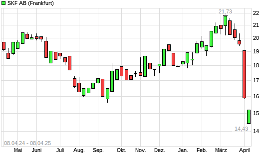 Mit dem Rücksetzer auf 14,86 EUR hat die Skf B-Aktie (ISIN SE0000108227) am 07.04.2025 ein neues 12-Monats-Tief erreicht und damit den Kurs vom 11.09.2024 eingestellt.