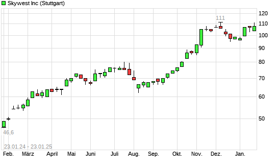 Mit dem Anstieg auf 111,00 EUR hat die SkyWest-Aktie (ISIN US8308791024) am 22.01.2025 ein neues All-Time-High erreicht und damit den Kurs vom 27.11.2024 eingestellt.