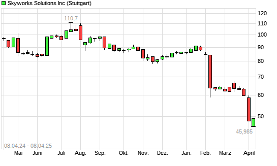 Mit dem Rücksetzer auf 45,46 EUR hat die Skyworks Solutions-Aktie (ISIN US83088M1027) am 07.04.2025 ein neues 10-Jahres-Tief erreicht und damit den Kurs vom 04.04.2025 eingestellt.
