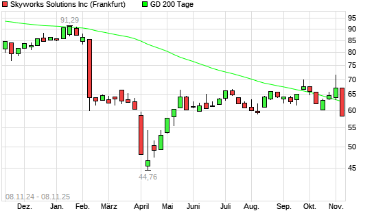 Mit dem Rücksetzer auf 58,43 EUR hat die Skyworks Solutions-Aktie am 07.11.2025 die 200-Tage-Linie nach unten gekreuzt.