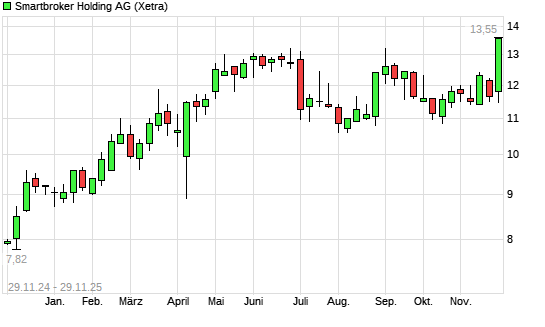 Mit dem Anstieg auf 13,40 EUR hat die Smartbroker (ex wallstreet:online)-Aktie (ISIN DE000A2GS609) am 28.11.2025 ein neues 3-Jahres-Hoch erreicht und damit den Kurs vom 26.06.2025 eingestellt.