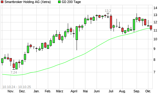 Mit dem Rücksetzer auf 10,90 EUR hat die Smartbroker (ex wallstreet:online)-Aktie am 09.10.2025 die 200-Tage-Linie nach unten gekreuzt.