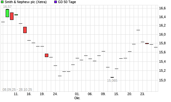 Mit dem Rücksetzer auf 15,68 EUR hat die Smith & Nephew-Aktie am 27.10.2025 die 50-Tage-Linie nach unten gekreuzt.