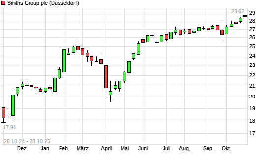 Mit dem Anstieg auf 28,66 EUR hat die Smiths Group-Aktie (ISIN GB00B1WY2338) am 27.10.2025 ein neues All-Time-High erreicht und damit den Kurs vom 24.10.2025 eingestellt.