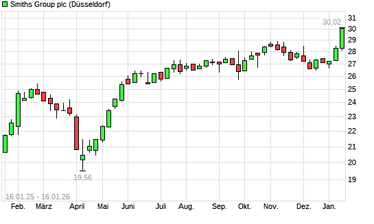 Mit dem Anstieg auf 29,32 EUR hat die Smiths Group-Aktie (ISIN GB00B1WY2338) am 15.01.2026 ein neues All-Time-High erreicht und damit den Kurs vom 03.11.2025 eingestellt.