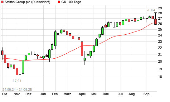 Mit dem Rücksetzer auf 26,26 EUR hat die Smiths Group-Aktie am 23.09.2025 die 100-Tage-Linie nach unten gekreuzt.