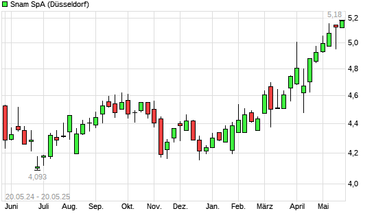 Mit dem Anstieg auf 5,13 EUR hat die Snam-Aktie (ISIN IT0003153415) am 19.05.2025 ein neues 12-Monats-Hoch erreicht und damit den Kurs vom 08.05.2025 eingestellt.