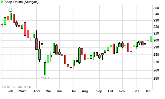 Mit dem Anstieg auf 302,40 EUR hat die Snap-On-Aktie (ISIN US8330341012) am 05.01.2026 ein neues 6-Monats-Hoch erreicht und damit den Kurs vom 09.12.2025 eingestellt.