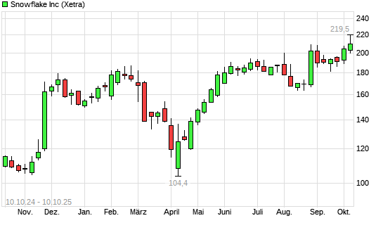 Mit dem Anstieg auf 216,80 EUR hat die Snowflake-Aktie (ISIN US8334451098) am 09.10.2025 ein neues 12-Monats-Hoch erreicht und damit den Kurs vom 08.10.2025 eingestellt.