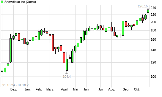 Mit dem Anstieg auf 234,30 EUR hat die Snowflake-Aktie (ISIN US8334451098) am 30.10.2025 ein neues 3-Jahres-Hoch erreicht und damit den Kurs vom 29.10.2025 eingestellt.