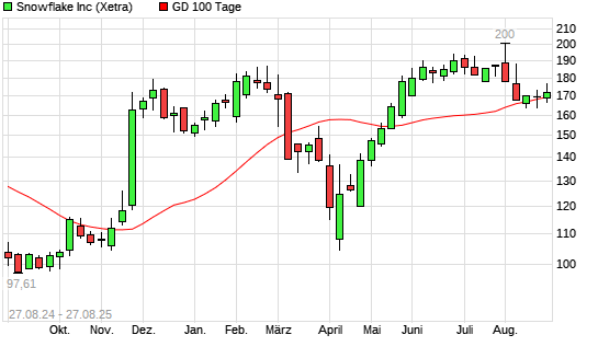 Mit dem Rücksetzer auf 166,24 EUR hat die Snowflake-Aktie am 26.08.2025 die 100-Tage-Linie nach unten gekreuzt.