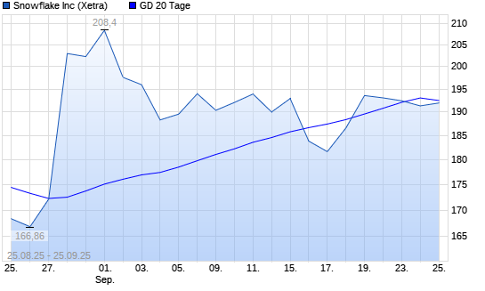 Mit dem Rücksetzer auf 189,62 EUR hat die Snowflake-Aktie am 24.09.2025 die 20-Tage-Linie nach unten gekreuzt.